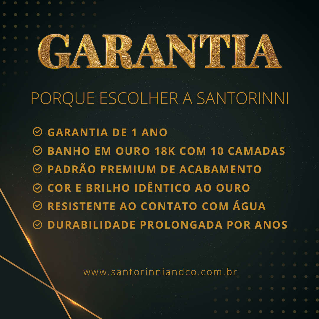 Cada jóia recebe banho de 10 camadas de ouro 18k quilates, uma aplicação especial de verniz protetor, desenvolvido para garantir um acabamento impecável, alta durabilidade e ao mesmo tempo criar uma barreira segura entre o metal e a pele.